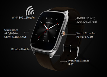 The ZenWatch 2 is the the 2015 follow up to the original ZenWatch produced by ASUS and both have the Qualcomm Snapdragon 400 1.2GHz CPU running the software/hardware with 512 RAM and 4GBs of on board storage while running off Android Wear. Unlike the current run of smartwatches, the ZenWatch 2 has a square screen instead of a round one. The downside to this screen is the rather large bezel that Asus likes to use on it’s screen. The watch also comes in two sizes – ‘larger’ and ‘smaller’ with the smaller one designed for slender wrists while the larger one boosts a slightly larger battery and screen along with thicker wrist straps.